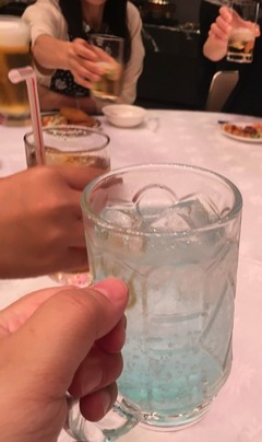 お酒はブルーのラムネ酎ハイ。