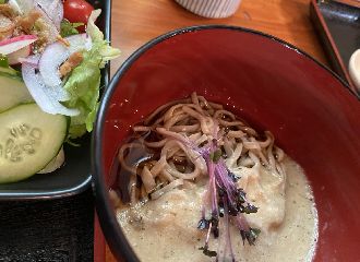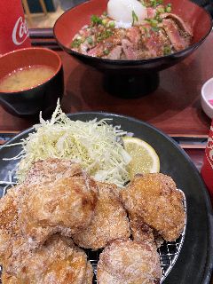 唐揚げ定食食べる~~。(奥にあるのは、さらさんのローストビーフ丼)