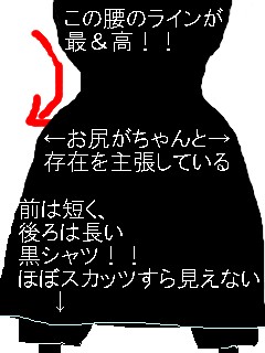 黒いシャツは前から見たらそけい部あたりが裾の長さなんだけど、